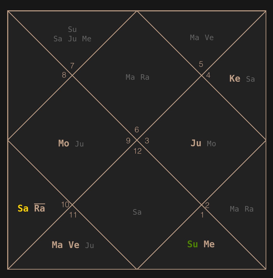 Первое, на что хочется обратить ваше внимание — на активный 5 дом (творчества), где стоит Сатурн и Раху, а также на наличие йоги креативности Марс и Венера (6 дом).