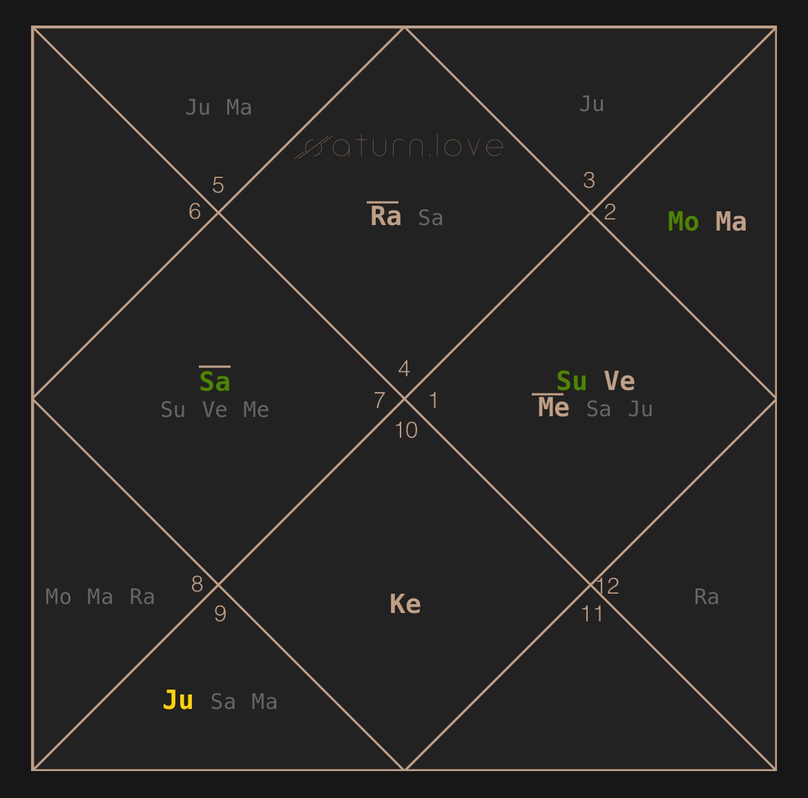 Луна, в свою очередь, управляется Венерой, стоящей в 10-м доме (бизнеса и карьеры). Венера создает соединение между 11-м, 10-м, а также 4-м домом (построения клана и организации), где стоит глобалист Сатурн.