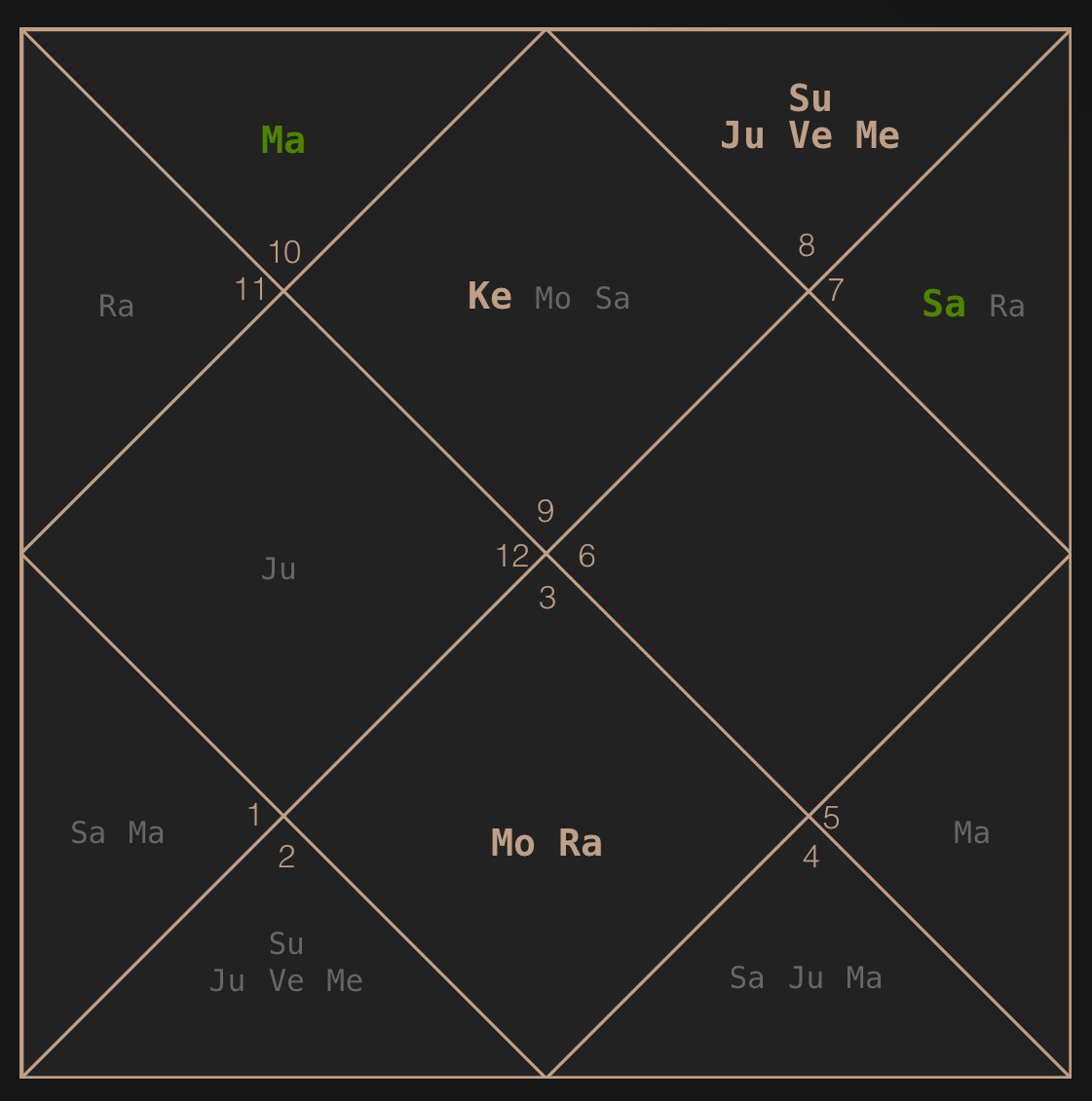 12-м домом в данной карте управляет Марс из 2-го дома — дома денег, речи, головы. Такое положение, в том числе, нередко встречается у спикеров.