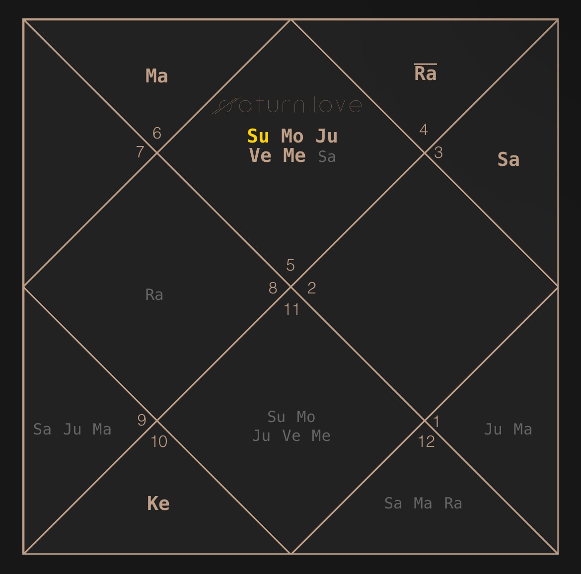 Такое положение указывает на программу огромной славы, но лишь во второй половине жизни и если человек следует своему предназначению. Радживу Ганди было 40 лет, когда он был избран премьер-министром, мгновенно получив мировую славу и международное признание после трагических событий.
